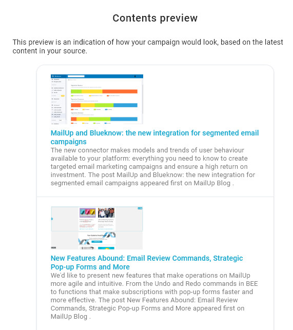 - Establecer la frecuencia de envío, eligiendo enviar según la actualización de la fuente (es decir, cuando se cargan nuevos contenidos) o estableciendo el día de la semana y el horario.