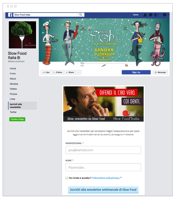 • Página de Facebook: el usuario medio emplea cada día unos 50 minutos en Facebook. Salir al encuentro de los usuarios también en esta plataforma es decisivo: se aconseja introducir un formulario de registro al boletín directamente en la página de tu empresa. Para ello, solo necesitas una simple app como esta.