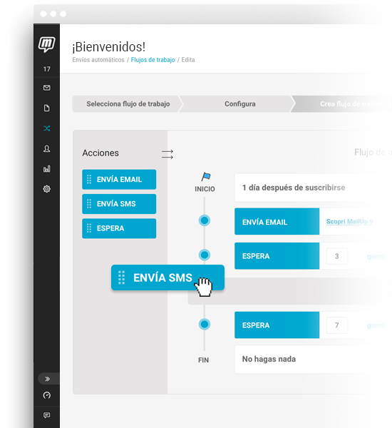 Gracias a la interfaz de arrastrar y soltar, bastan unos clics para poner a punto un flujo automatizado de email y SMS.