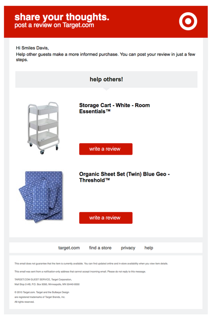 Para cultivar la relación con el usuario es importante acompañarle hasta el final de su recorrido haciéndole entender lo importante que es su opinión. Así que no dudes en preguntar a tus clientes acerca de su grado de satisfacción o si recomendarían tu producto o servicio. Crea comunicaciones automatizadas con las cuales solicitar una valoración o una reseña de la compra y programa encuestas por e-mail: recibir un feedback es la mejor manera de entender dónde mejorar, qué cambiar y cuáles son las expectativas que tienes que satisfacer.