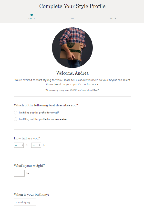Por último, el mundo de los datos en relación con los intereses de las personas. Un amplio segmento de informaciones fundamental en el B2C. Con los formularios de perfilado y páginas de aterrizaje puede pedir a tus clientes y posibles clientes algunas informaciones que puedes aprovechar para preparar comunicaciones personalizadas. Pongamos por ejemplo un e-commerce de prendas de vestir: Stitch Fix pide a cada nuevo suscrito que rellene una página formada por tres fichas: Stats (las medidas del cuerpo), Fit (las preferencias de corte de las prendas: slim, regular, skinny…), Style (las preferencias de estilo: business, casual, formal, night-out…).