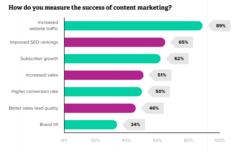 Al observar el tema de los “objetivos” desde otro punto de vista, encontramos que la métrica tomada como referencia por la mayoría de las empresas (89%) es el tráfico del sitio, seguido del desempeño en términos de indexación SEO (65%).