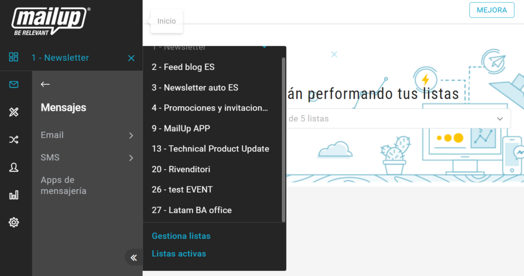 Un ejemplo de entorno multilista, directamente desde nuestra plataforma MailUp utilizada para nuestros newsletters
