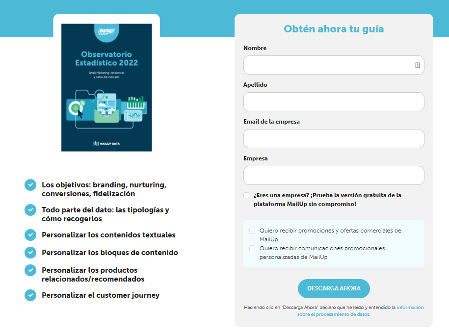 - a través de la descarga de contenido relevante. Guías, e-books, webinars, documentos técnicos: todos los recursos que creas pueden representar oportunidades para obtener datos importantes y recopilar nuevas direcciones, simplemente ingresando un formulario de descarga para acceder al recurso que incluya un campo de correo electrónico y otra información relevante.
