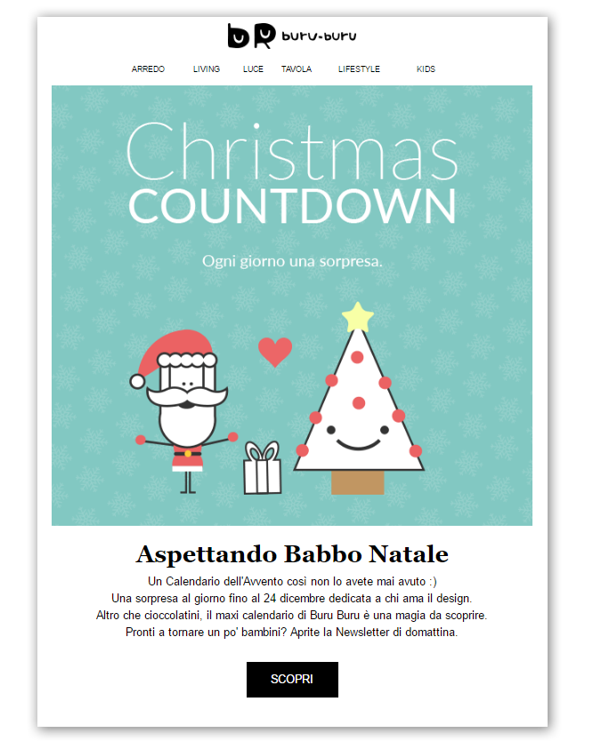 AllPosters, por ejemplo, ha creado una hermosa campaña gota a gota con 5 días de ofertas navideñas: de lunes a viernes, un e-mail al día con una descuento especial sobre varios tipos de productos. El toque especial con respecto a una promoción normal surge de la creación de expectativas: los días siguientes están «ocultos», y se revelarán sólo en el momento adecuado, fidelizando al usuario en la apertura de los e-mail de Navidad.