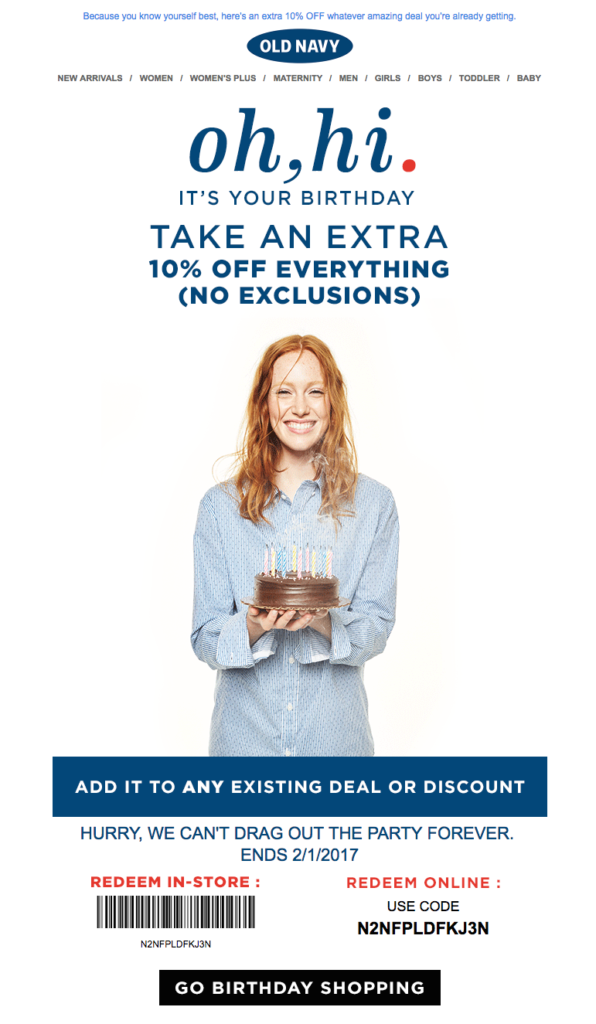 Añadir un GIF animado en el mensaje de e-mail es sencillo y extremadamente eficaz a nivel visual. Old Navy elige uno de corte empático y divertido, la clásica tarta con velitas, combinado con un código de cupón creado expresamente y válido tanto para la tienda física como para usarlo online.