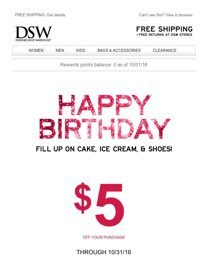 El e-mail de cumpleaños se parece más a una tarjeta de felicitación que a un boletín de noticias. Por ello, es conveniente reducir el texto al mínimo y resaltar adecuadamente el cupón o el regalo, asegurándonos de que no se pierda entre florituras inútiles. Veamos un ejemplo de DSW – en su extremada simplicidad, es refinado y de clarísima lectura.
