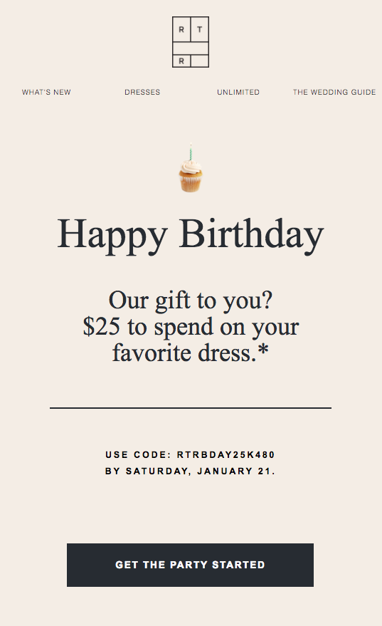 El botón de CTA, lo repetimos a menudo, tiene una importancia fundamental a la hora de garantizar altos índices de clics en los e-mail. En el caso del cumpleaños, ¿por qué no jugar con un texto que se salga de lo común, que subraye lo excepcional de la jornada? Rent the Runway, por ejemplo, toma una decisión acertada: “Get the party started”, “¡Que comience la fiesta!”. ¡No puede ser más atrayente!