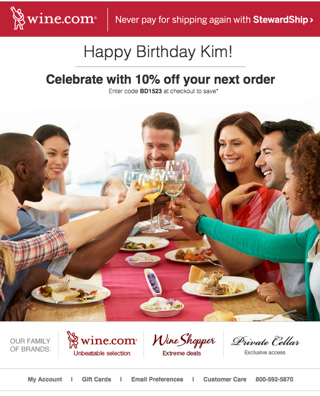La personalización, en los e-mail, funciona. Tanto a nivel de objeto (“¡María Julia, aquí tienes tu regalo de cumpleaños!” como dentro del e-mail, los resultados están garantizados: según las estimaciones más conservadoras, trae consigo como mínimo un aumento del +2,6% en los índices de apertura (datos de Retention Science). El cumpleaños es el momento «personal» por excelencia: aprovechar ese «gancho» íntimo y personal para crear una línea de comunicación aún más directa con el usuario solo puede ser bueno. Veamos el ejemplo de Wine.com: