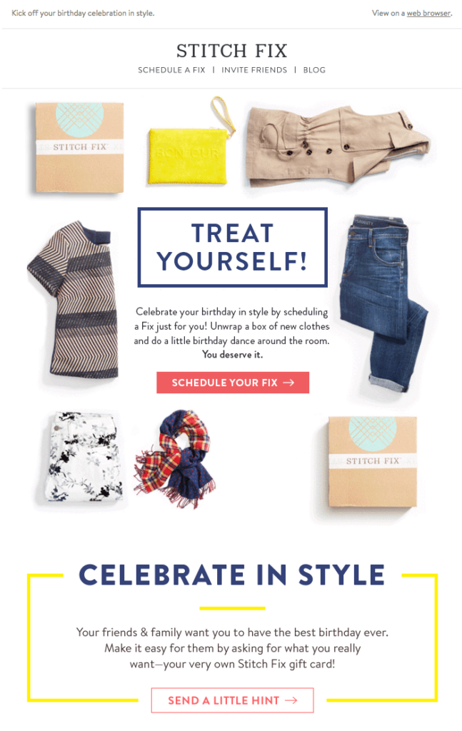 La habíamos mencionado antes: la guía de regalos es una forma extraordinaria de interpretar el cumpleaños. La base es muy sencilla: si el usuario está suscrito a nuestras comunicaciones, significa que aprecia los productos que proponemos y ¿qué mejor táctica que convencerle de que se los regalen sus amigos y parientes? Stitch Fix, por ejemplo, diversifica la estrategia comunicativa: en la primera casilla propone la autocomplacencia, mientras en la segunda invita a crear una lista con los regalos que se desean. Naturalmente, un e-mail de este tipo exige una cierta anticipación en su envío, con respecto al día X.