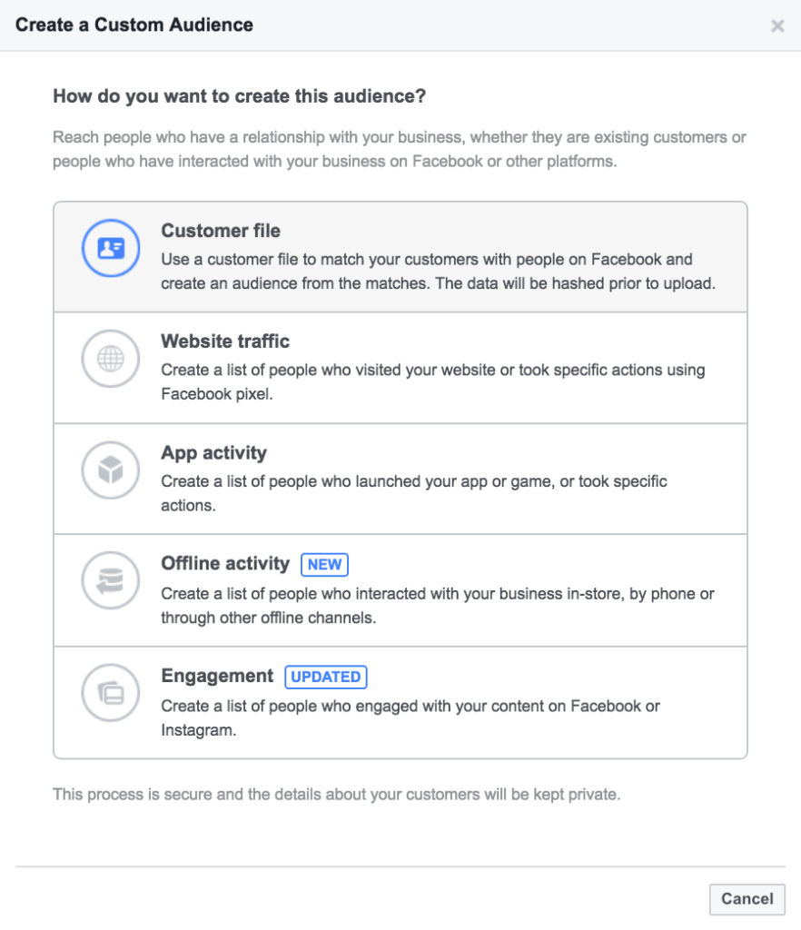 Puedes hacerlo o bien creando un público personalizado a partir de los visitantes de tu sitio web con ayuda del píxel de Facebook, o bien creando un público personalizado a partir de tus clientes potenciales, o bien usando CRM retargeting.