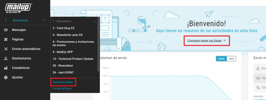 - Volúmenes de correo, gracias a un gráfico que muestra la cantidad de correos electrónicos o mensajes SMS enviados en los últimos seis meses
