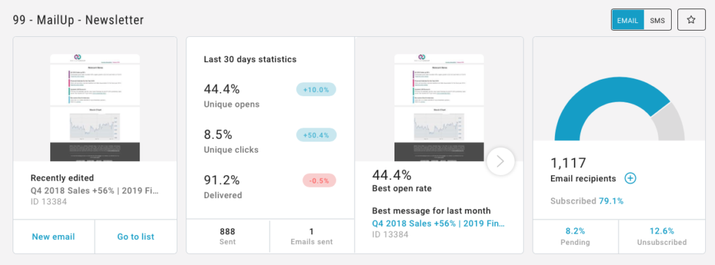 - Último envío, con las estadísticas del último mensaje enviado, dividido por aperturas y clics: al hacer clic en él puede acceder al informe detallado respectivo (un clic en el asunto del correo electrónico le permite ver una vista previa o editar el mensaje)