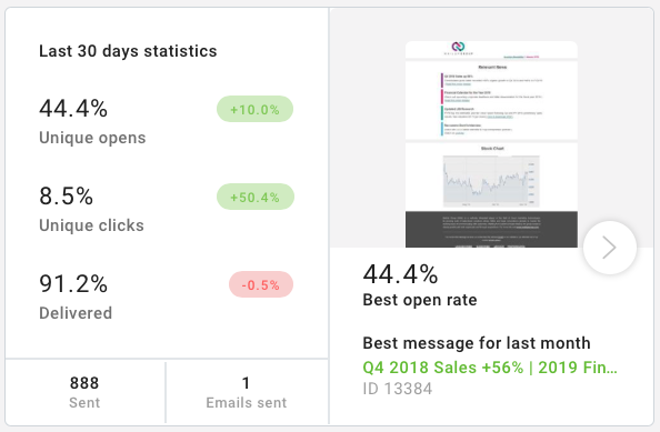 Encontrará las tasas de clics abiertos y únicos y las tasas de entrega (junto con las variaciones en comparación con los 30 días anteriores) Luego, además de un resumen de los destinatarios alcanzados y el número de correos electrónicos enviados, encontrará un pequeño informe que identifica los mensajes que destacan por sus tasas de apertura y clics, con los números relativos.