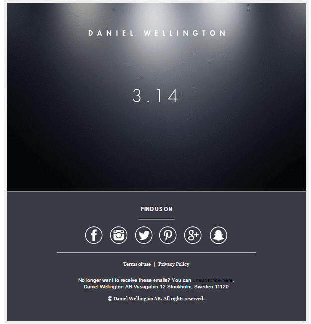 Un GIF animado es extremadamente eficaz también para dar mayor dignidad a un simple e-mail de texto, que de no ser por ello resultaría banal o insulso. Es suficiente un simple juego como el que aquí vemos de Daniel Wellington, o un efecto de animación de palabras que se componen, o que cambian de color. ¡La imaginación es lo que cuenta!