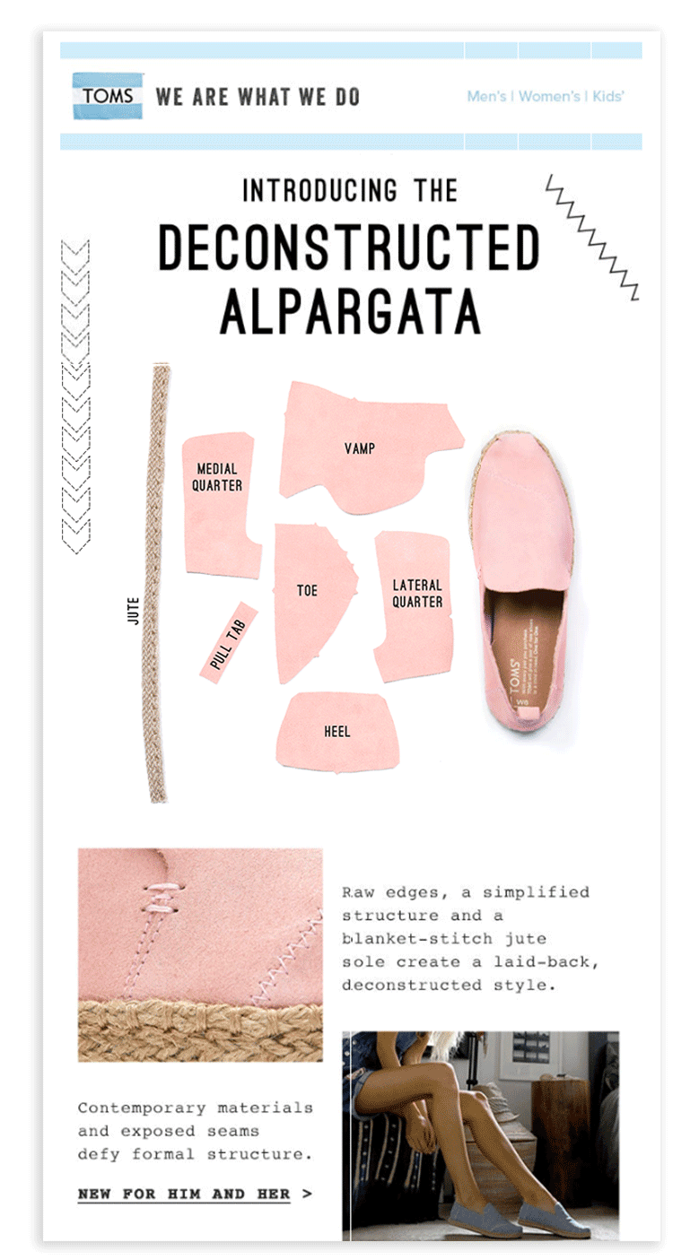 Es el mantra del marketing de nuestros días: contar historias acerca del producto, hacer narrativa, dar una dimensión más con respecto al «escaparate» con la descripción y el precio. Los GIF animados pueden ser una ayuda muy útil en esto. Toms las utiliza para mostrar las partes que constituyen un mocasín aparentemente simple, satisfaciendo varios fines al mismo tiempo.