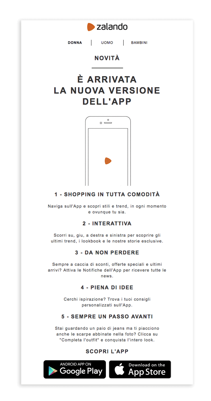 ¿Nueva App? ¿Nuevo sitio web? ¿Por qué no hacer probar la experiencia de navegación mediante un GIF animado? Así lo hace, por ejemplo, Zalando en el e-mail de lanzamiento de la nueva versión de la aplicación móvil. Una manera simple de dar una idea tangible del funcionamiento de la UX, invitando a efectuar la descarga.