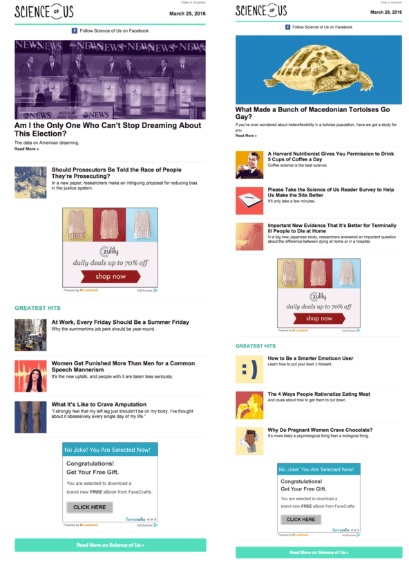 Además, no todos los boletines informativos de resúmenes deben ser interminables. Una práctica adecuada es presentar un titular, seguido de contenido secundario, sin proporcionar una lista extensa de todas las historias de su sitio. El boletín informativo de Science of Us de NY Mag hace justamente eso. Estos son dos ejemplos recientes: