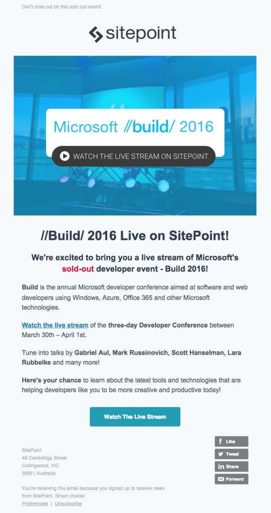 SitePoint, el sitio web y la empresa de desarrolladores web, adopta un enfoque similar en el correo electrónico de invitación a su seminario web (asunto: Transmisión en vivo: Microsoft Build 2016):
