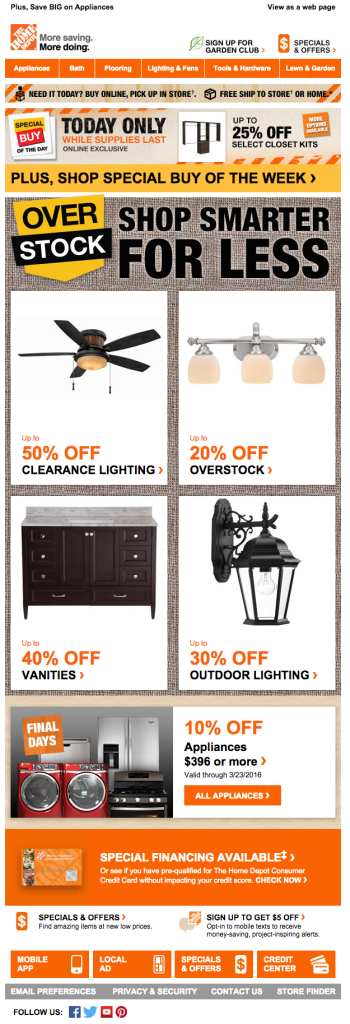 Los correos electrónicos no son sitios web. Un correo electrónico enfocado y breve debe diseñarse para mantener la claridad y debe comunicar una CTA. Por lo tanto, no hay necesidad de apiñar el correo electrónico, o el encabezado, con vínculos, menús o mensajes superfluos, como en este correo electrónico de Home Depot: