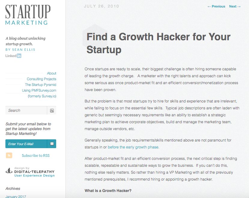 Esto lo llevó a publicar una anuncio de trabajo“Find a Growth Hacker for your startup” (Busca un Growth Hacker para tu empresa emergente).