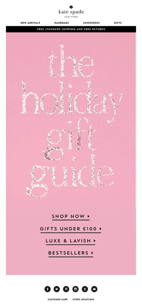 El truco: lo importante, en este caso, es no pasar desapercibidos. Un mensaje mínimo es eficaz si va acompañado de una versión visual que entusiasme. El ejemplo de Kate Spade es fantástico: un texto de lo más simple que se hace irresistible con el destello de las lentejuelas (añadidas gracias a una animación GIF).