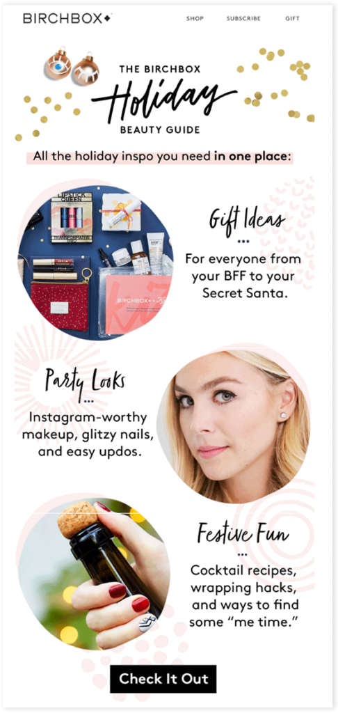 Birchbox lo sabe bien: por ello une a la clásica Guía Gift unas secciones específicas para la época del año, para encontrar el mejor look e inspiraciones enogastronómicas. Un énfasis sobre los contenidos no comerciales que tiene unas excelentes posibilidades de éxito.
