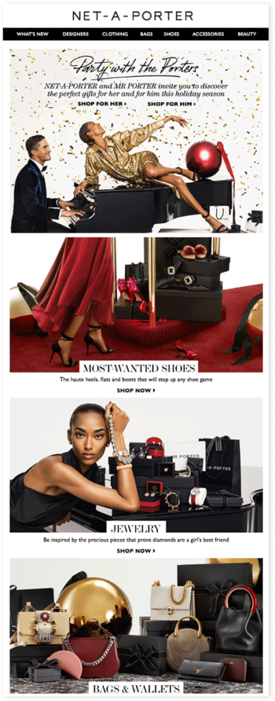 • Dando énfasis a determinadas categorías, por ejemplo los más vendidos o los tipos más comprados como regalos, como hace Net-A-Porter en el siguiente ejemplo