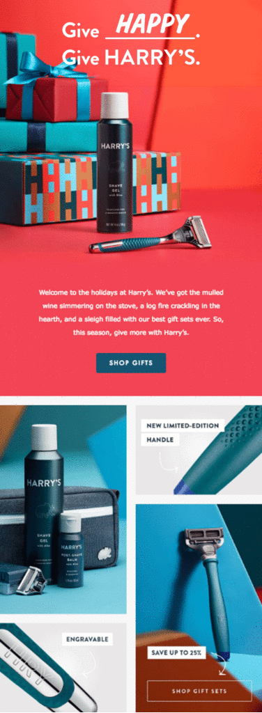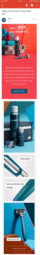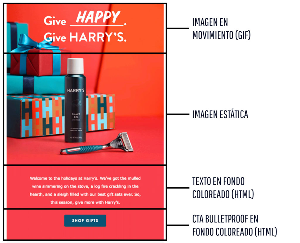 Seguimos con la Guía de Regalos de Harry’s. La forma más simple de construir un e-mail como este sería introducir en una imagen todo el contenido del primer elemento visual: aspectos gráficos, texto y botón CTA «de imitación». Esto, sin embargo, podría causar serios problemas de visualización en caso de que las imágenes no se cargasen correctamente.