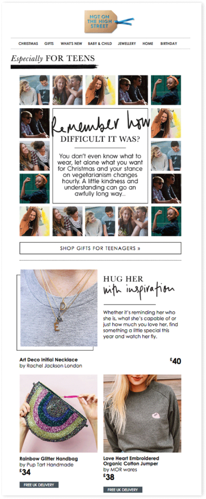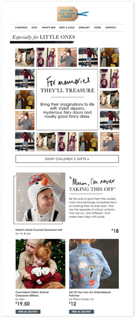 Otra posibilidad es subdividir la comunicación de la Guía de Regalos en varios «capítulos» temáticos, uno a la semana, por ejemplo. Es lo que hace Notonthehighstreet, en la galería bajo estas líneas, que articula los regalos en una campaña de tonos nostálgicos y emotivos… y ¡acierta!.