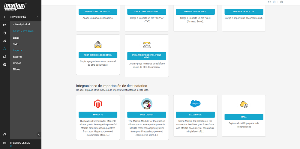 Con el nuevo catálogo puedes conocer la integración más útil según la sección de la plataforma en que estés trabajando: significa que, según el área funcional en que te encuentres, MailUp te sugerirá la integración más coherente con ese conjunto de actividades. Por ejemplo, como puede verse en la siguiente pantalla, en la página «Importación» de los contacto se sugieren los conectores vinculados con esa actividad.