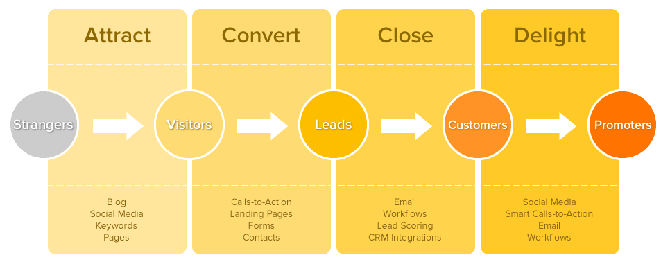 En la metodología inbound podemos distinguir cuatro etapas fundamentales. El siguiente gráfico, procedente de Hubspot, sitúa bajo cada fase las técnicas y las herramientas necesarias.
