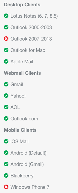 Y, si bien en general los clientes de email suelen admitir perfectamente los GIF animados,no todos ellos lo hacen. Según Litmus, las principales excepciones son las versiones más recientes de Microsoft Outlook (2007 ), que en lugar de mostrar el movimiento, mostrarán solamente el primer fotograma de la animación. Lo mismo ocurre con Windows Phone 7. Por esa razón es crucial diseñar todos los GIF asumiendo que quizás los lectores solo van a ver el primer fotograma.