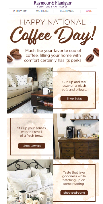 Raymour & Flanigan, pese a ser una marca de decoración, en la siguiente campañan aprovecha la jornada mundial del café para promover la decoración de los espacios internos de la casa con sus muebles, para saborear en ellos a gusto la famosa bebida: