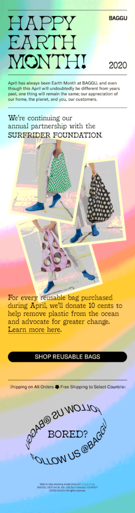 En este segundo ejemplo, Baggu incentiva la venta de sus bolsos aprovechando como ocasión no tradicional el mes dedicado a la tierra y al medio ambiente, con una campaña orientada no solo al aumento de las compras, sino también a reforzar la reputación de la marca, apoyándose en las decisiones éticas de la empresa y en la iniciativa de destinar parte de los ingresos a una causa noble.