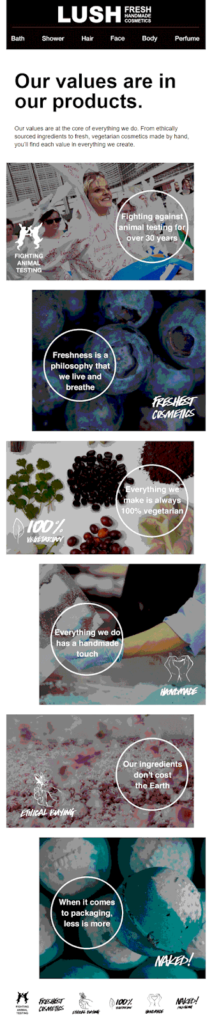 Mensajes centrados en la misión y los valores de la marca, campañas de naturaleza informativa que muestran lo que hay detrás de tus procesos de producción o mensajes de e-mail que presentan a los colaboradores, la cultura de empresa y el ambiente laboral son solo algunos ejemplos de contenidos que no se refieren a una venta directa, pero que ciertamente crean valor y mejoran tu reputación, aumentando por consiguiente la confianza del público en relación contigo y, por tanto, las probabilidades de que las futuras decisiones de compra recaigan sobre ti.