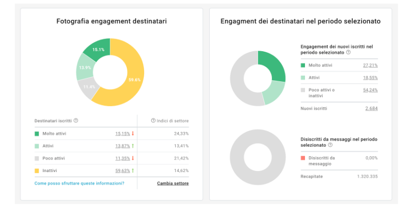 Con la piattaforma MailUp, gracias a las nuevas funciones del área Estadísticas y a la información sobre la participación de los destinatarios registrados, puedes examinar la composición de tu base de datos en términos de participación a través de los dos gráficos Historial del comprmiso de los destinatarios y Compromiso de los destinatarios en el periodo seleccionado.