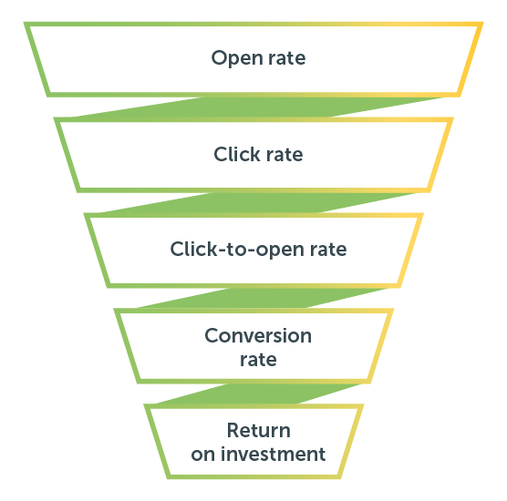 Ahora nos detendremos principalmente en los KPI on-mail, los que se refieren a la interacción del usuario con el mensaje en sí: un conjunto de datos que podemos representar como un funnel, un embudo.