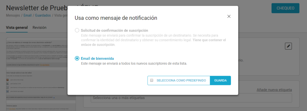 - crear mensajes de bienvenida y de confirmación de la suscripción directamente, ya no solo en el editor HTML, sino también en el editor BEE de la plataforma