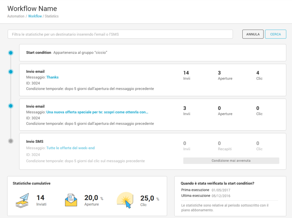 - los datos de cada destinatario, con la posibilidad de filtrarlos por email y SMS.