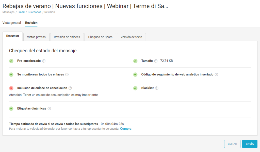 Hemos perfeccionado la página que se encarga de efectuar un control final o check-up de los mensajes antes de enviarlos (la encontrarás en la opción Revisión, una vez dentro del mensaje): en lugar de la información sobre el mensaje (siempre disponible en la sección Resumen), encontrarás nuevas y completas respuestas a cada opción de control. ¿La plataforma te señala un defecto en las tag dinámicas? Con un clic puede entender en detalle de qué se trata y obtener respuestas puntuales sobre cómo intervenir.