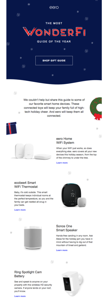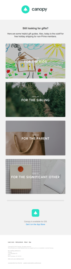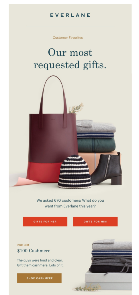 En una encuesta sobre el contenido favorito de los consumidores para las festividades de 2020, los consumidores expresaron sus preferencias por las reseñas de productos y, luego, las guías tradicionales de regalos. Al diseñar tus correos electrónicos, usa el potencial de los contenidos generados por el usuario (CGU), enviando comunicaciones que contienen reseñas sobre productos que el usuario ha visto en el pasado o una selección de los más vendidos y los artículos más votados de la comunidad.