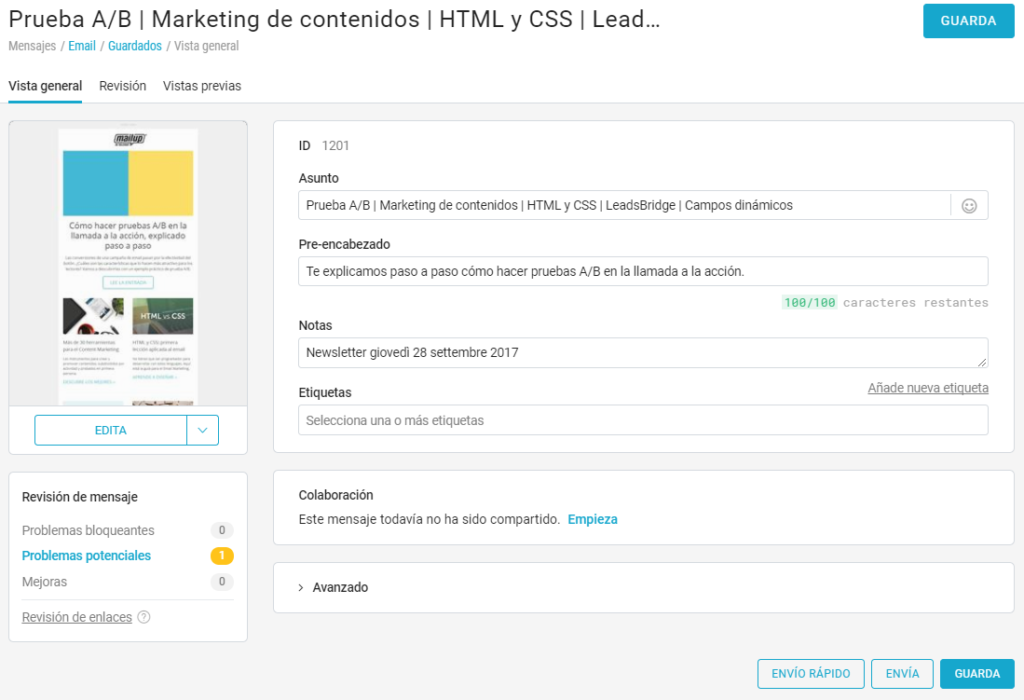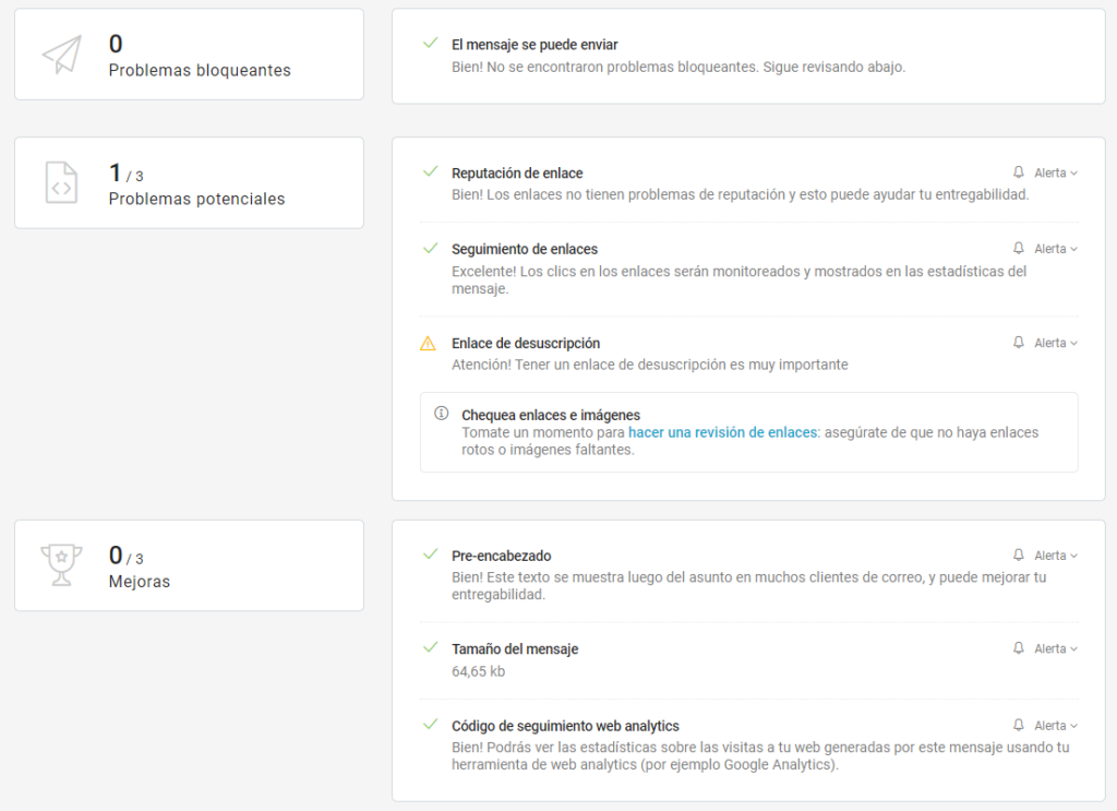 En la página de Resumen de un mensaje encontrarás el nuevo recuadro del Chequeo directamente bajo la imagen de la vista previa del email. En caso de problemas, el chequeo mostrará el nivel de gravedad: bastará un clic sobre la opción de que se trate para ser redireccionados a la página chequeo por extenso, donde podrás ver los detalles y las medidas a tomar para resolver los problemas.