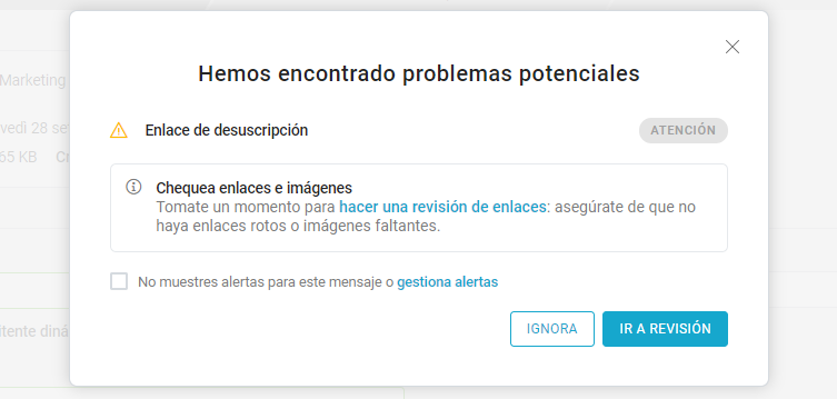 En caso de que el mensaje presente problemas y puntos críticos, se abrirá un cuadro de diálogo modal en el momento de guardar o enviar.