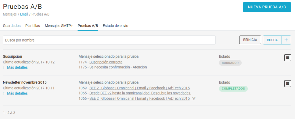 La lista de las pruebas A/B se ha mejorado, dotándola con un campo de búsqueda avanzada, de algunos detalles y del status de cada prueba. Las posibles operaciones (Acciones) son ahora coherentes con el estado de cada prueba.