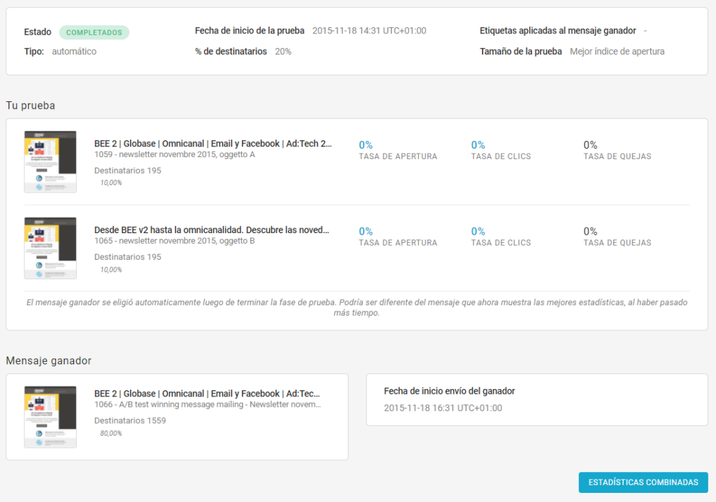 Una vez completada la carga, la plataforma muestra una vista previa clara y detallada de cómo se ha configurado la prueba A/B. Si se ha establecido un criterio automático de victoria, el envío se programará en esta sección.
