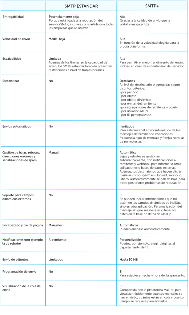 En concreto, veamos las posibilidades que ofrece SMTP+, comparándolo con un servidor SMTP estándar: