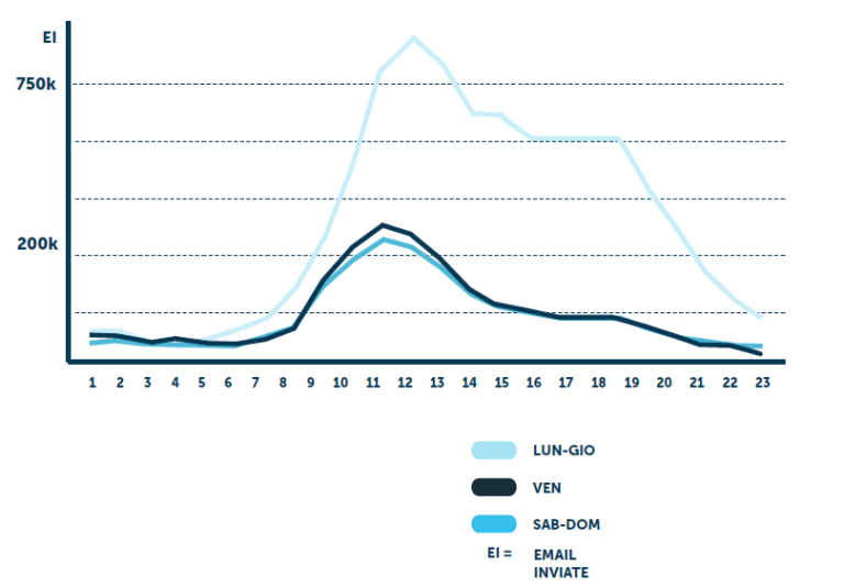 Los análisis por semana y por hora nos dan una idea bastante clara del mercado del Marketing por correo electrónico: los envíos de las empresas se concentran en los días de semana, a expensas del fin de semana, donde hay una caída muy marcada en los volúmenes.