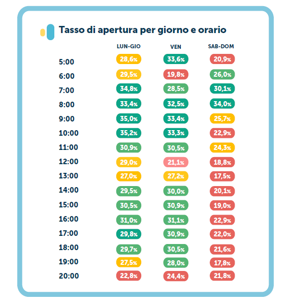 Un dato que se confirma también al analizar los horarios de apertura: el estudio muestra que entre las 11 y las 15 horas de lunes a jueves, los destinatarios tardan menos en abrir el correo electrónico; en otras palabras, a la hora del almuerzo, entre las últimas horas de la mañana y las primeras horas de la tarde, se reduce el intervalo entre la entrega del correo electrónico y su apertura.