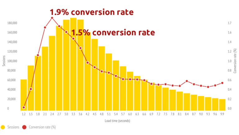Un estudio de Kinsta, por otro lado, analiza el problema desde un ángulo diferente: el 74 % de los usuarios abandonan las páginas que no se cargan en 5 segundos; mientras que los datos a continuación, de Soasta, muestran cómo las conversiones comienzan a colapsar antes de 2 segundos.